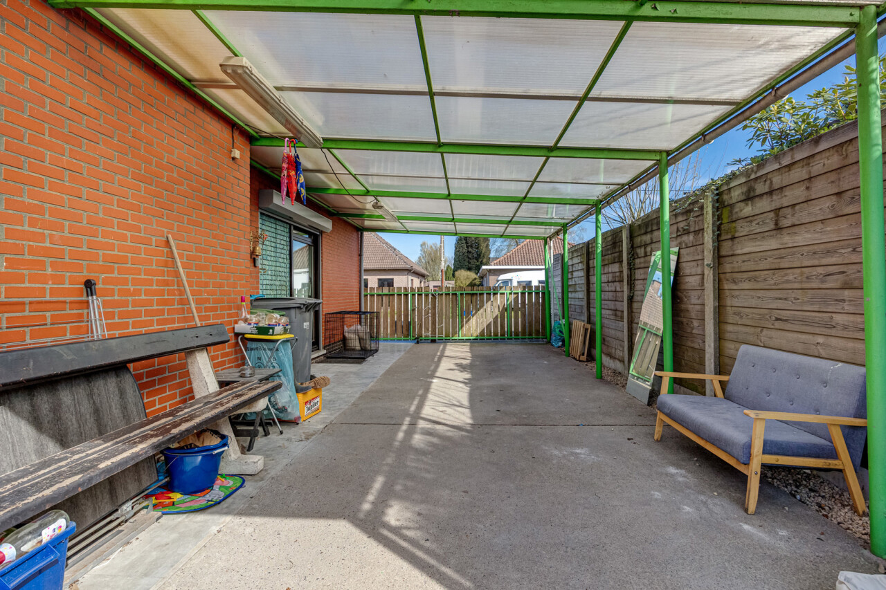 Buiten : carport, terras, tuin. Gemetseld bijgebouw : 7,00 m x 5,70 m : tegelvloer, toilet, keukenblok