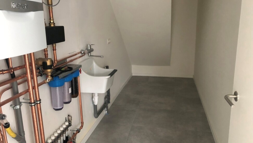 Berging / wasplaats : 8,00 m² : tegelvloer, wastafel, aansluitpunt voor wasmachine, aardgas combiketel Vaillant.
