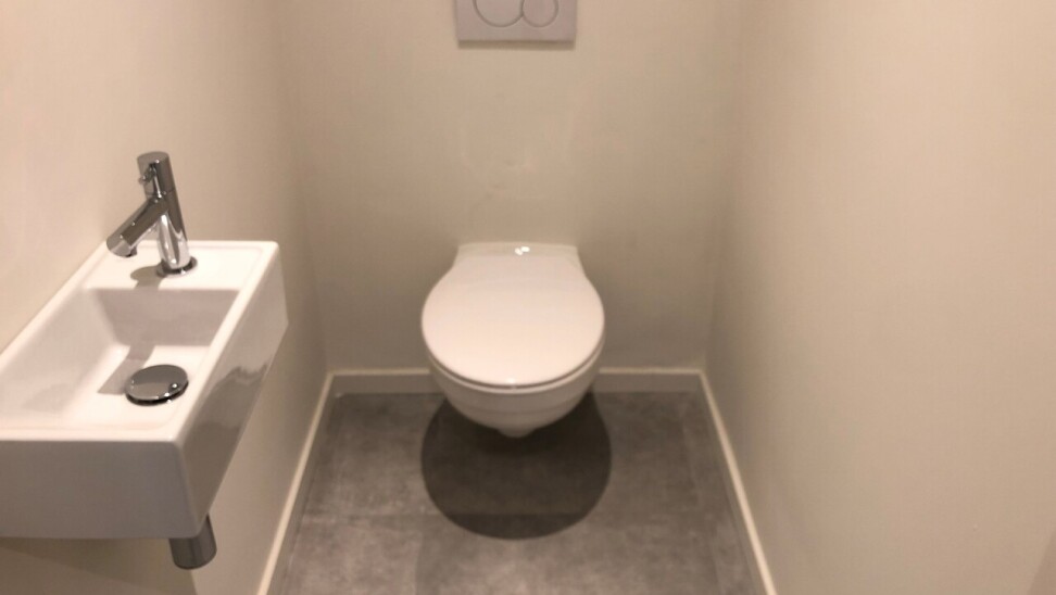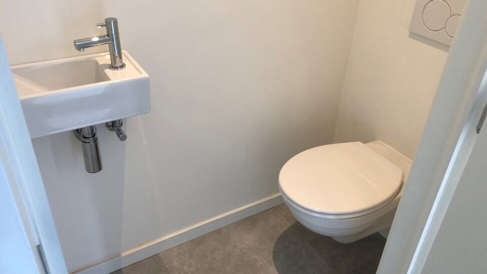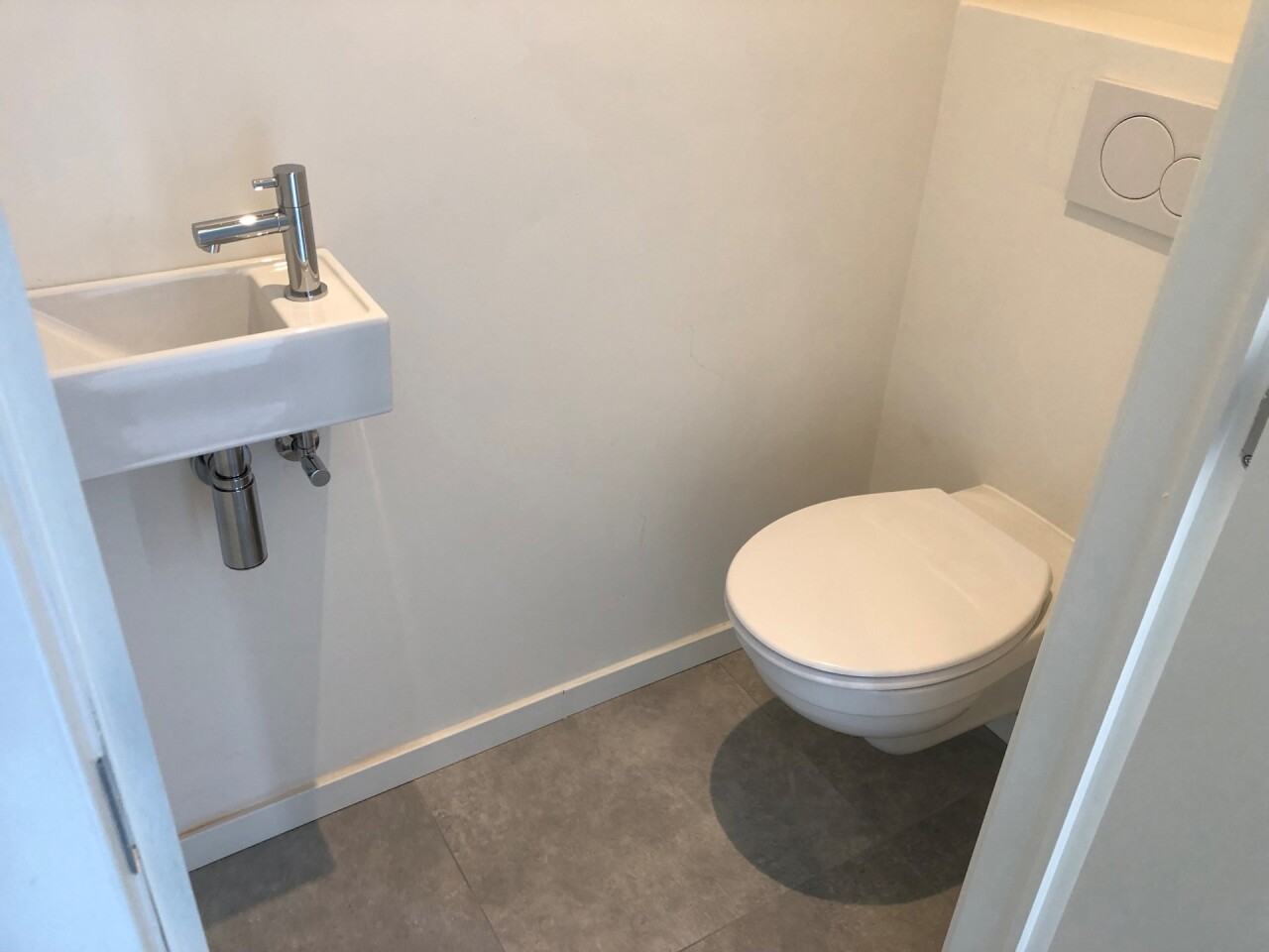 Inkomhal : tegelvloer, gastentoilet, trap naar de verdieping.