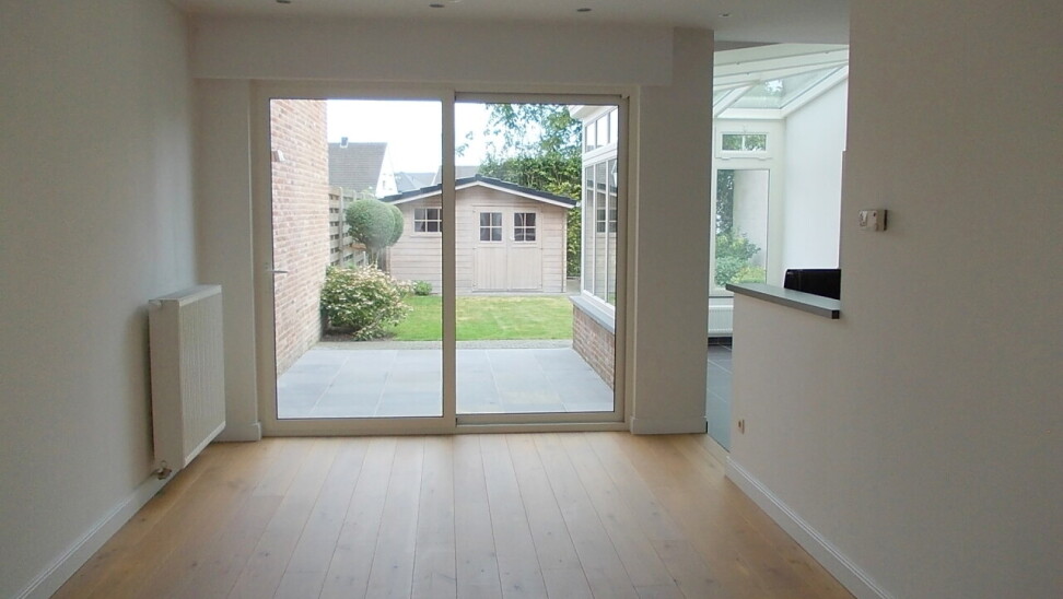 WOONKAMER : 8,20 m x 3,25 m : eikenhouten parketvloer, schuifraam naar terras.