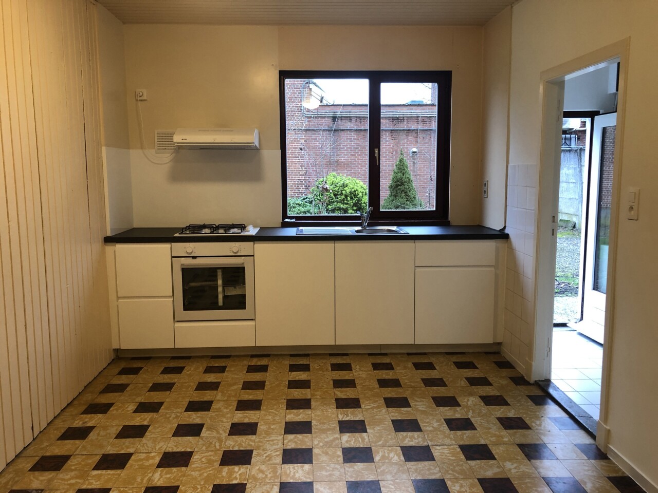 KEUKEN : 6,00 m x 3,00 m : nieuwe aanbouwkeuken met gaskookplaat, dampkap. Tegelvloer.