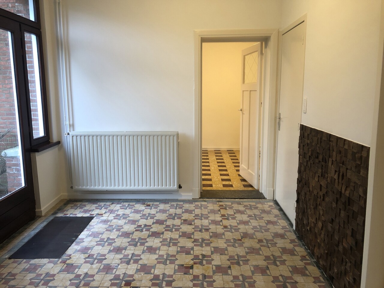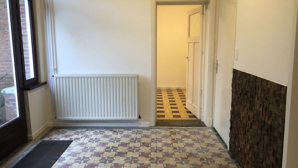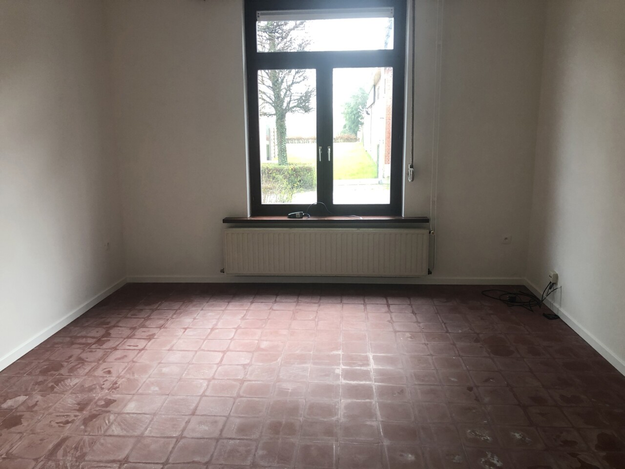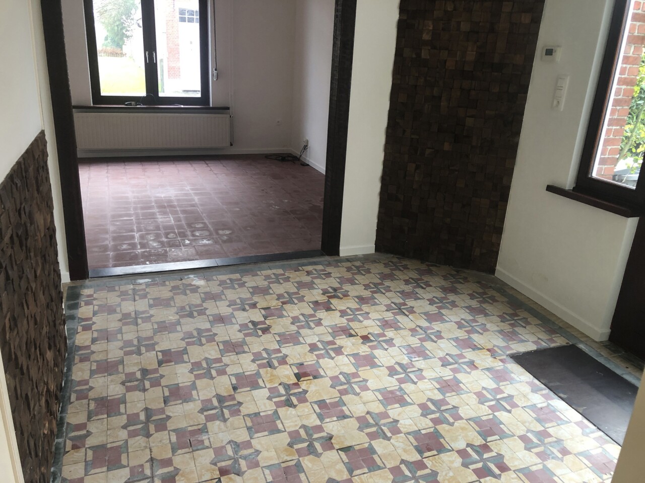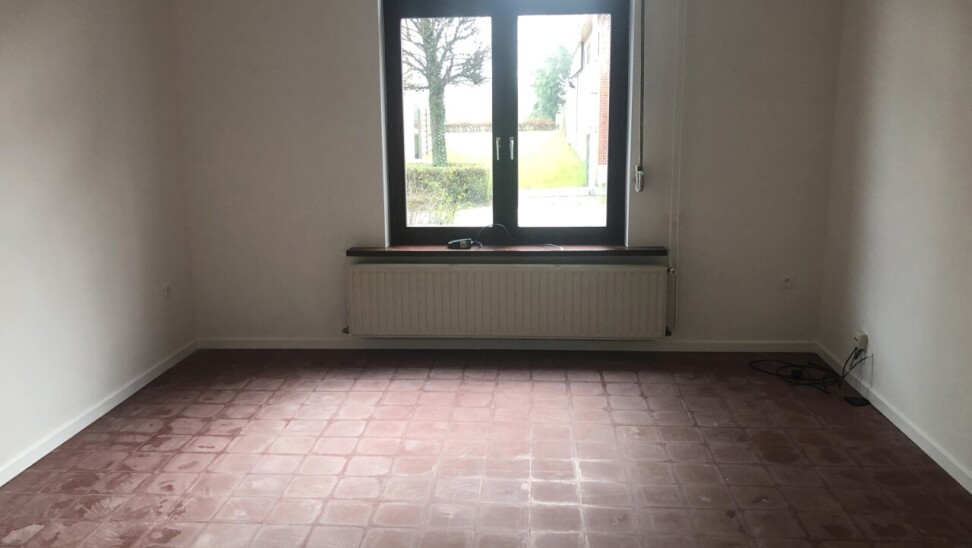 WOONKAMER : tegelvloer. Eethoek : 3,00 m x 2,75 m + zithoek : 4,00 m x 4,00 m.