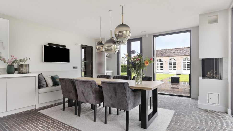 Woonkamer : 38,00 m² met sfeervolle open haard, veel lichtinval door de vele raampartijen en toegang tot kantoor.