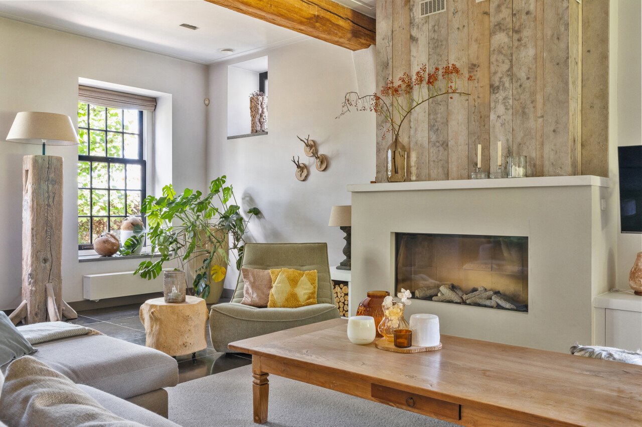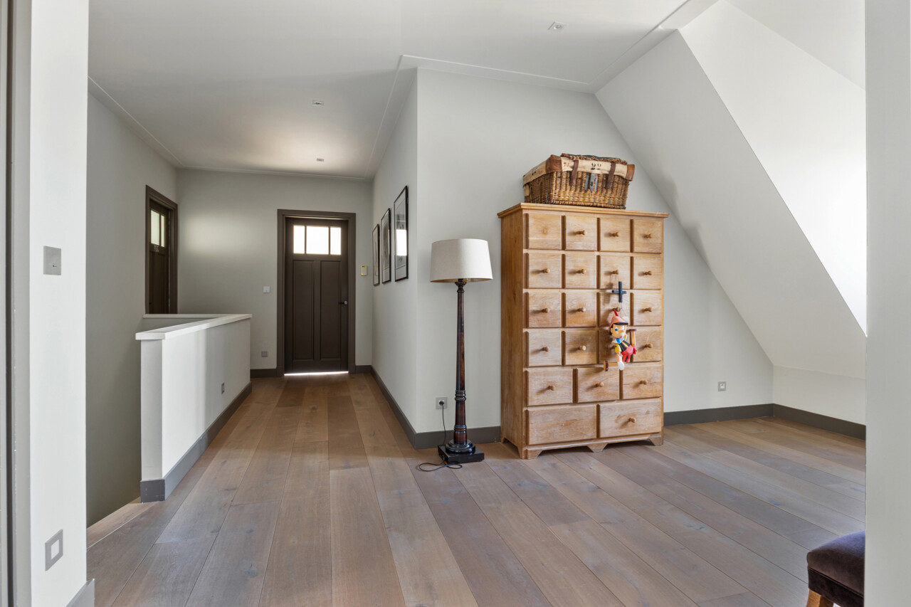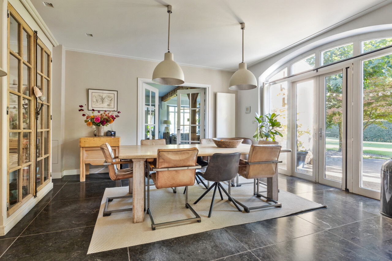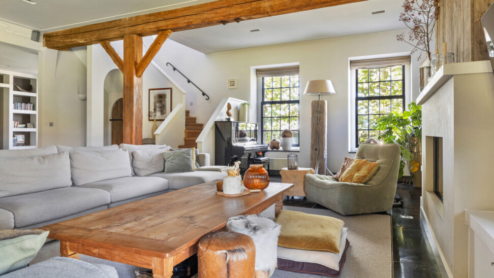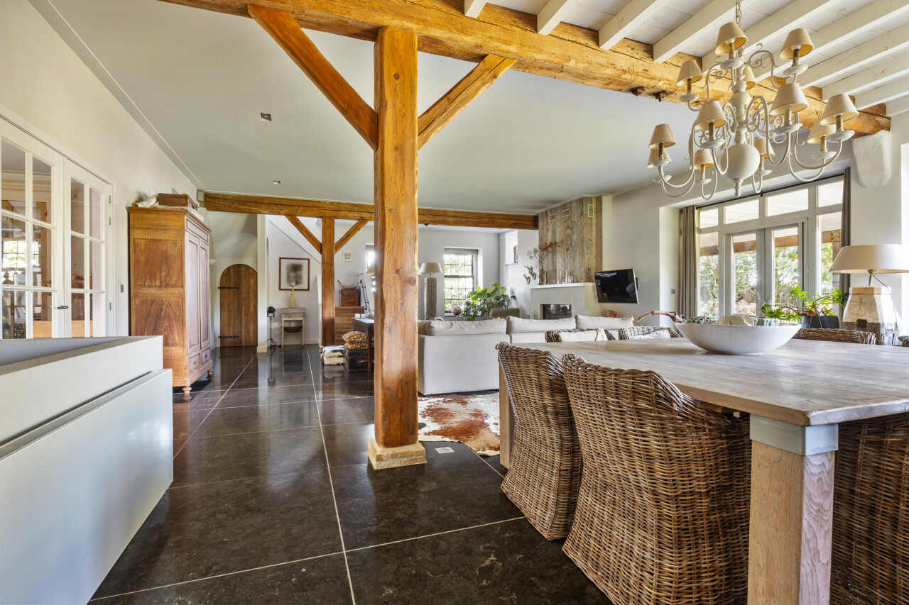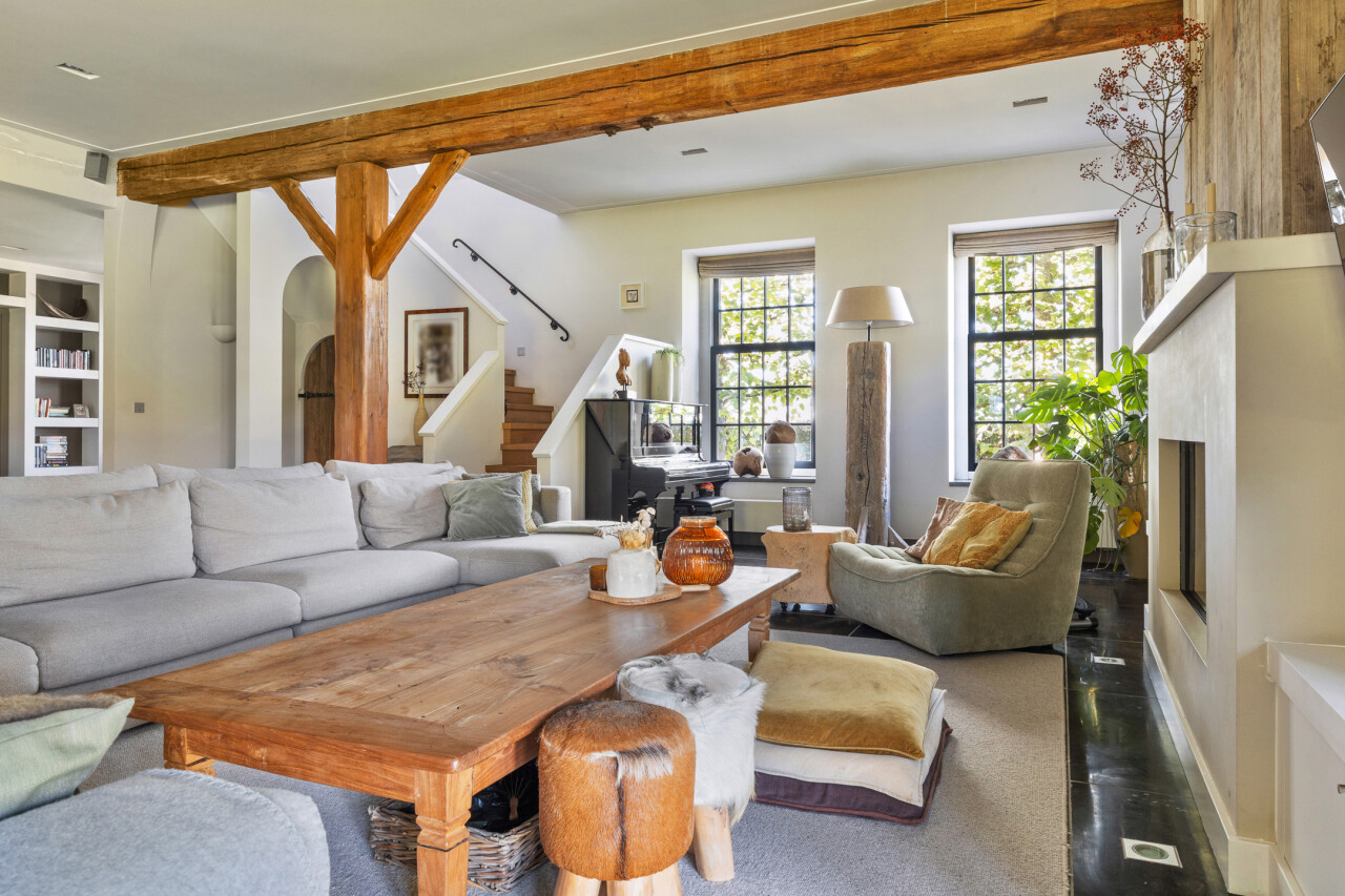 Woonkamer : zeer ruime woonkamer met houten balken, prachtige lichtinval, designtrap naar de verdieping, schouw met sfeervolle gashaard en openslaande deuren naar een overdekt terras en de tuin.