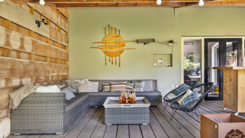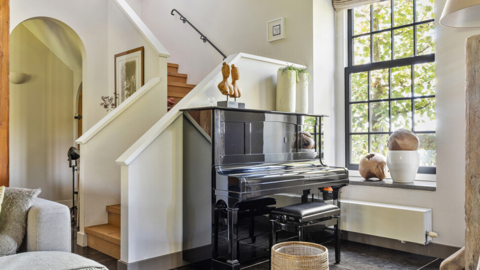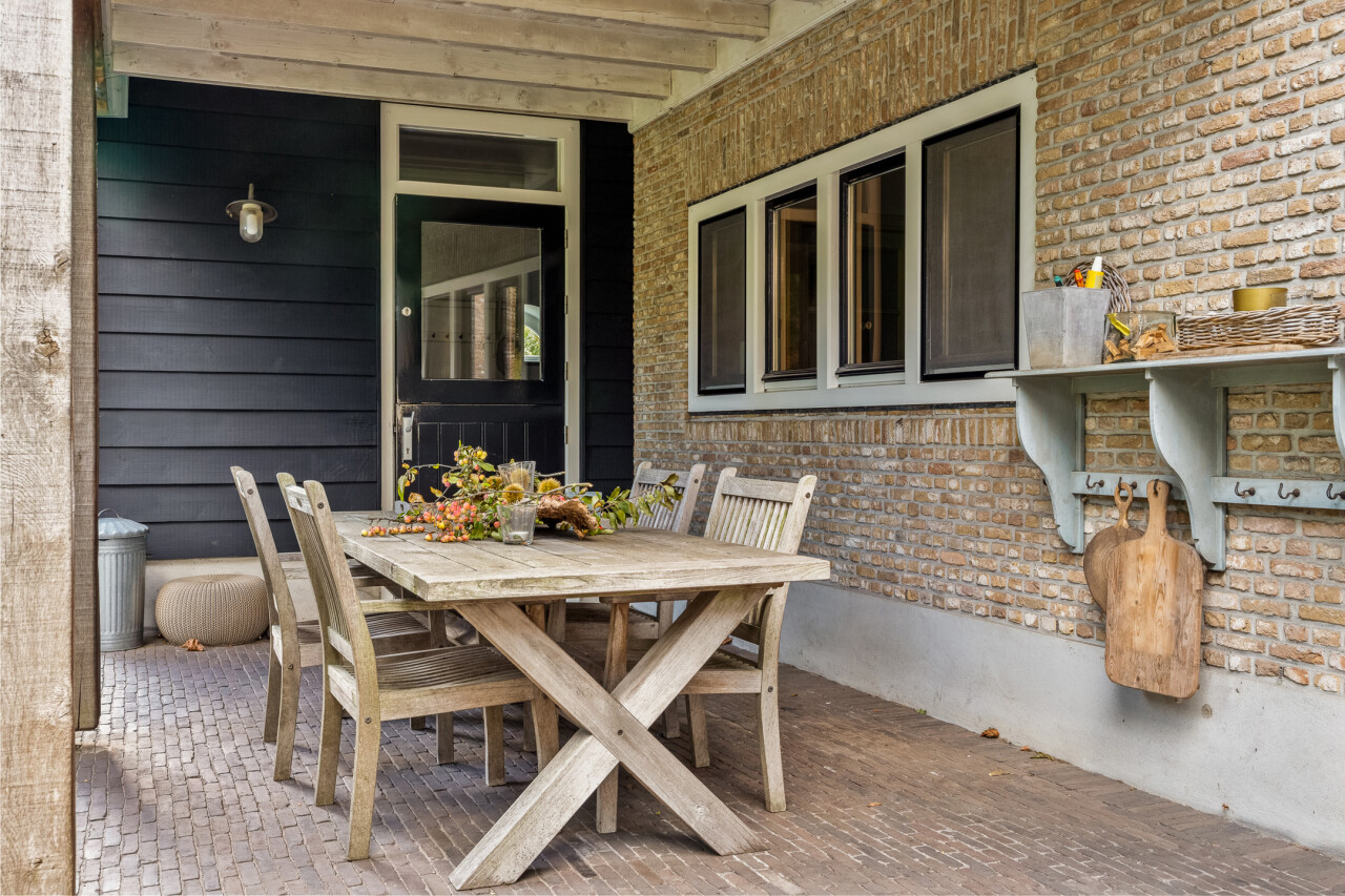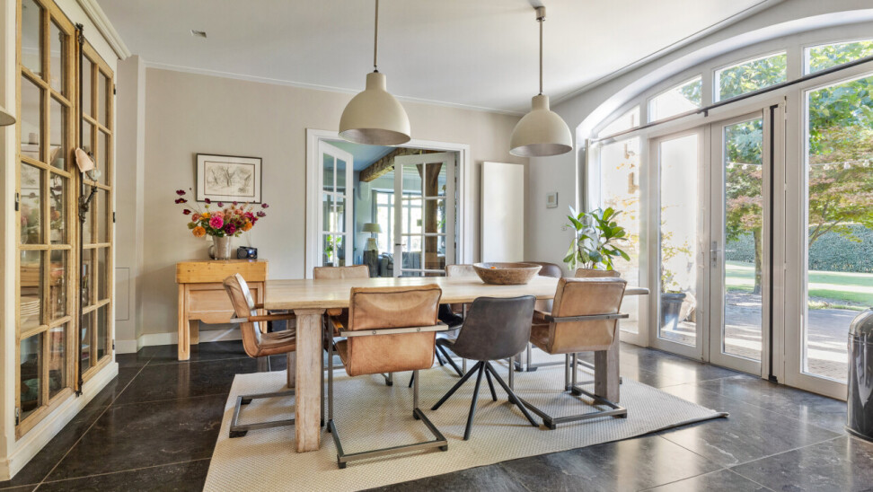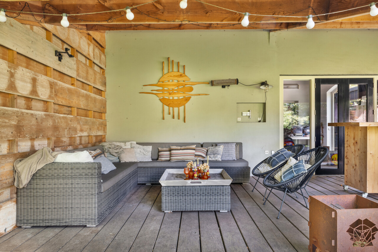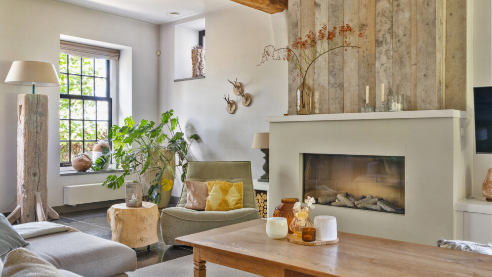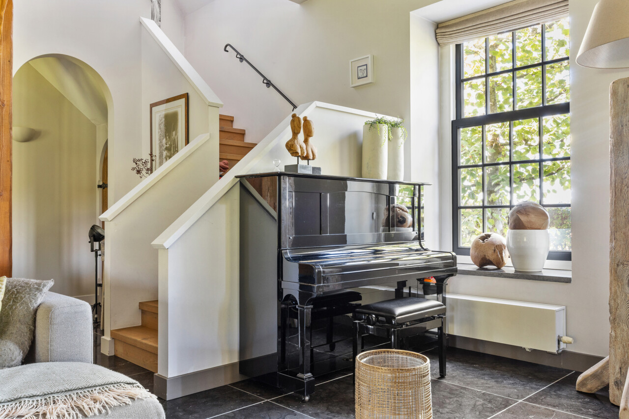 Woonkamer : zeer ruime woonkamer met houten balken, prachtige lichtinval, designtrap naar de verdieping, schouw met sfeervolle gashaard en openslaande deuren naar een overdekt terras en de tuin.