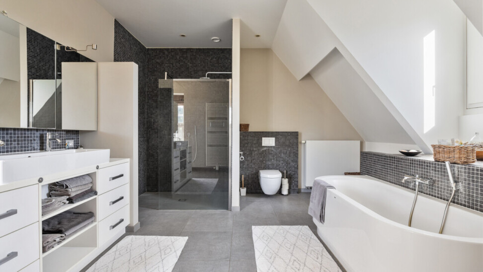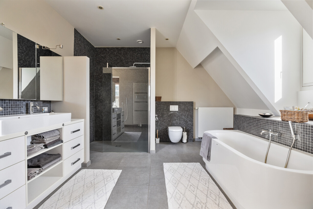 Slaapkamer 1 : met aparte kleedruimte en een eigen luxe badkamer : met ligbad, dubbele wastafel met badkamermeubel, inloopdouche, sierradiator, toilet.