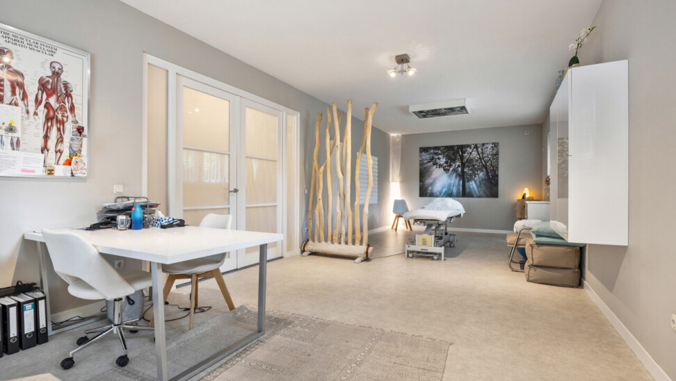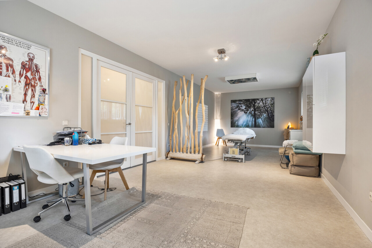Praktijkruimte : met een toiletruimte, een keukenblok met koelkast, een badkamer met een inloopdouche.